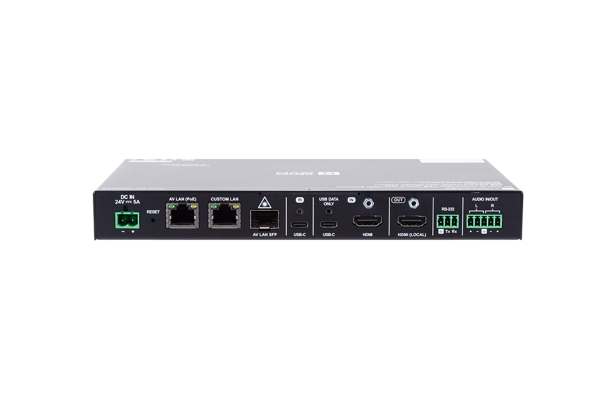 Gemini GVN is designed as a flexible AV-over-IP ecosystem that scales efficiently across large or asymmetrical AV deployments. As a member of this ecosystem, the HC-TX220AP offers best-in-class end-to-end latency and seamless switching between sources. In addition to video and USB peripheral data, the Full-Featured USB-C input can optionally provide Ethernet connectivity to the connected BYOD host, allowing hassle-free network access over the same single cable. The HC-TX220AP can be powered either via PoE from the network switch in simplified installations, or by the optional 160W external power supply when the 100W USB Power Delivery functionality is required. Network connectivity is provided over an SFP cage for fiber based systems or dual RJ45 ports for copper installations. One RJ45 port is dedicated to the Gemini GVN network, while the second RJ45 port is a custom LAN interface that can be used for user Ethernet-over-USB bridging or for a physically separated Dante network on the DNT variant.