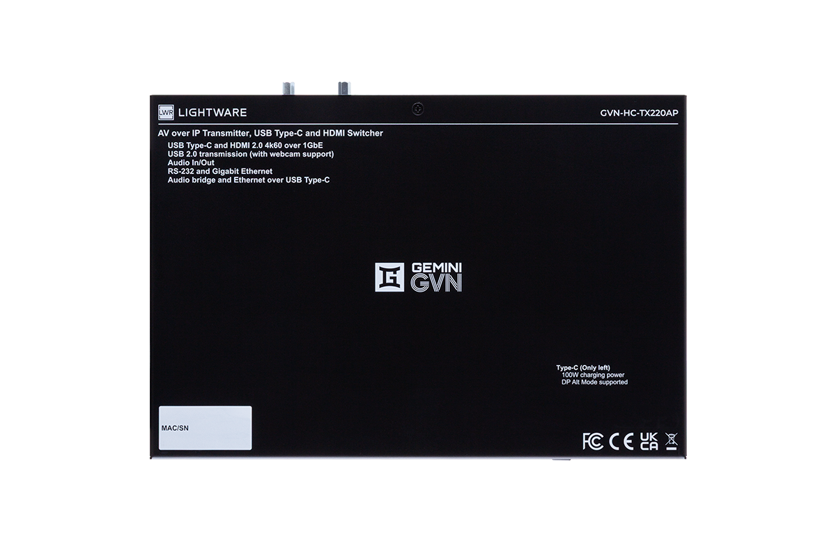 The GVN-HC-TX220AP is the next-generation transmitter in Lightware’s Gemini GVN family that brings Full-Featured USB-C connectivity to 1G AV-over-IP deployments. The USB-C input accepts 4K60 4:4:4 video with audio while providing a fully transparent and independent USB data layer and optional 100W fast charging for BYOD hosts. In addition to USB-C, a second host computer can take advantage of a combination of HDMI 2.0 input plus data-only USB-C ports. Selection between the two local hosts can be eirher manual or automated based on signal presence or priority. USB device traffic is handled as true USB 2.0 over IP to allow HID devices and peripherals such as webcams and speakerphones to be extended and switched through the GVN system with behavior consistent with local USB connections. The GVN-HC-TX220AP features a local HDMI 2.0 loop-out for a mirrored local preview and offers a stereo analog audio port (selectable In or Out) for local audio connections.